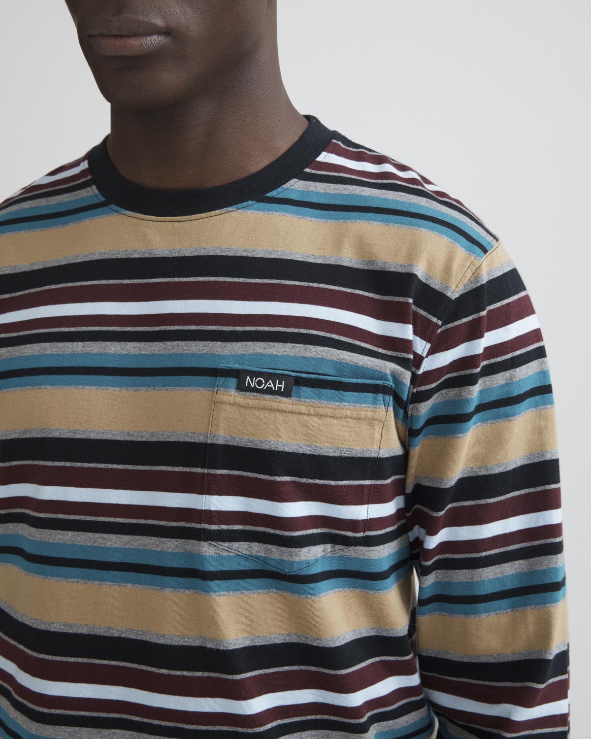 Made in Portugal. 100% cotton jersey with yarn-dyed engineered stripes. Patch pocket at chest with woven label.